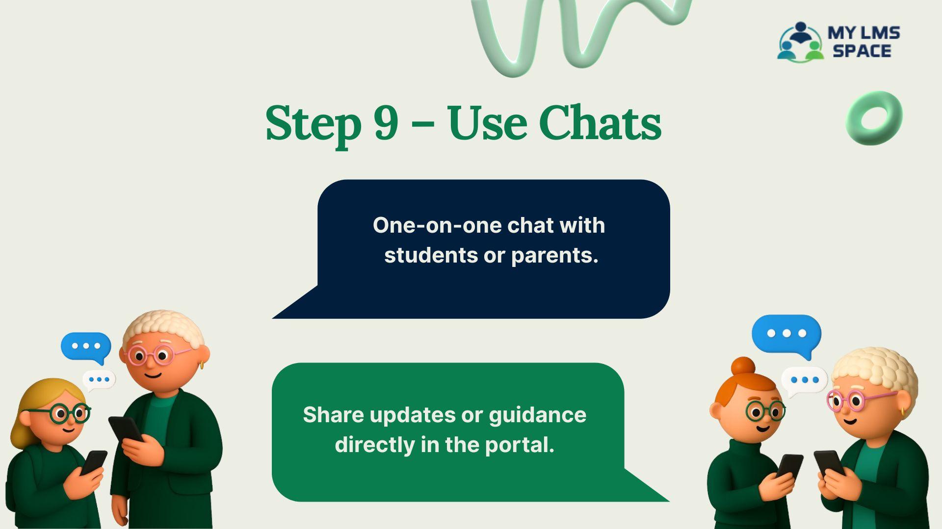 Stay connected through private chat—teacher to student, or parents to teacher—for quick updates and personal guidance.